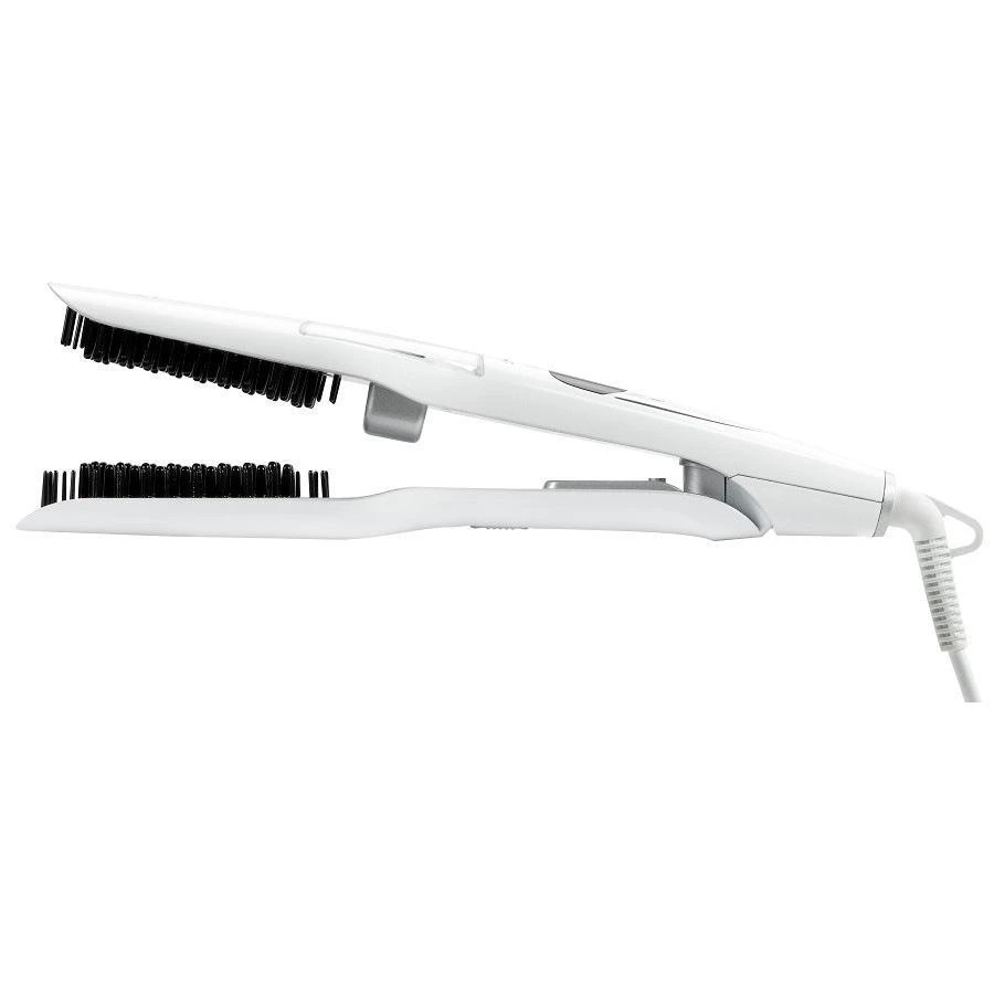 - Een stijlborstel die werkt met stoom en het haar snel en gemakkelijk steil maakt zonder het te laten pluizen of het te beschadigen.