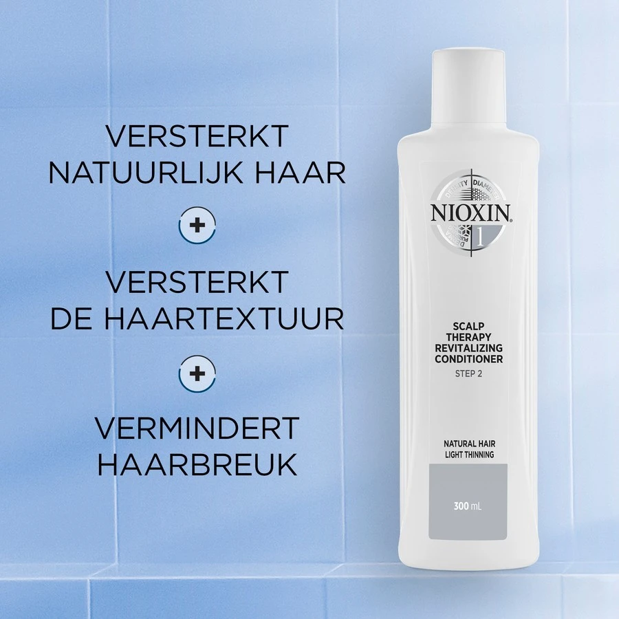 Versterk en hydrateer het haar met NIOXIN Systeem 1 Scalp Therapy Revitalising Conditioner voor natuurlijk, normaal tot dun uitziend haar. Deze conditioner met BioAmp technologie helpt het haar veerkrachtiger te maken en de vochtbalans onder controle te houden. NIOXIN Systeem 1 is speciaal ontwikkeld voor natuurlijk, normaal tot dun uitziend haar en laat het haar er dikker en voller uitzien. De Scalp Therapy Revitalising Conditioner is de tweede stap van een 3-delige NIOXIN-behandeling, ontworpen om het haar te versterken en de haarstructuur te verbeteren.