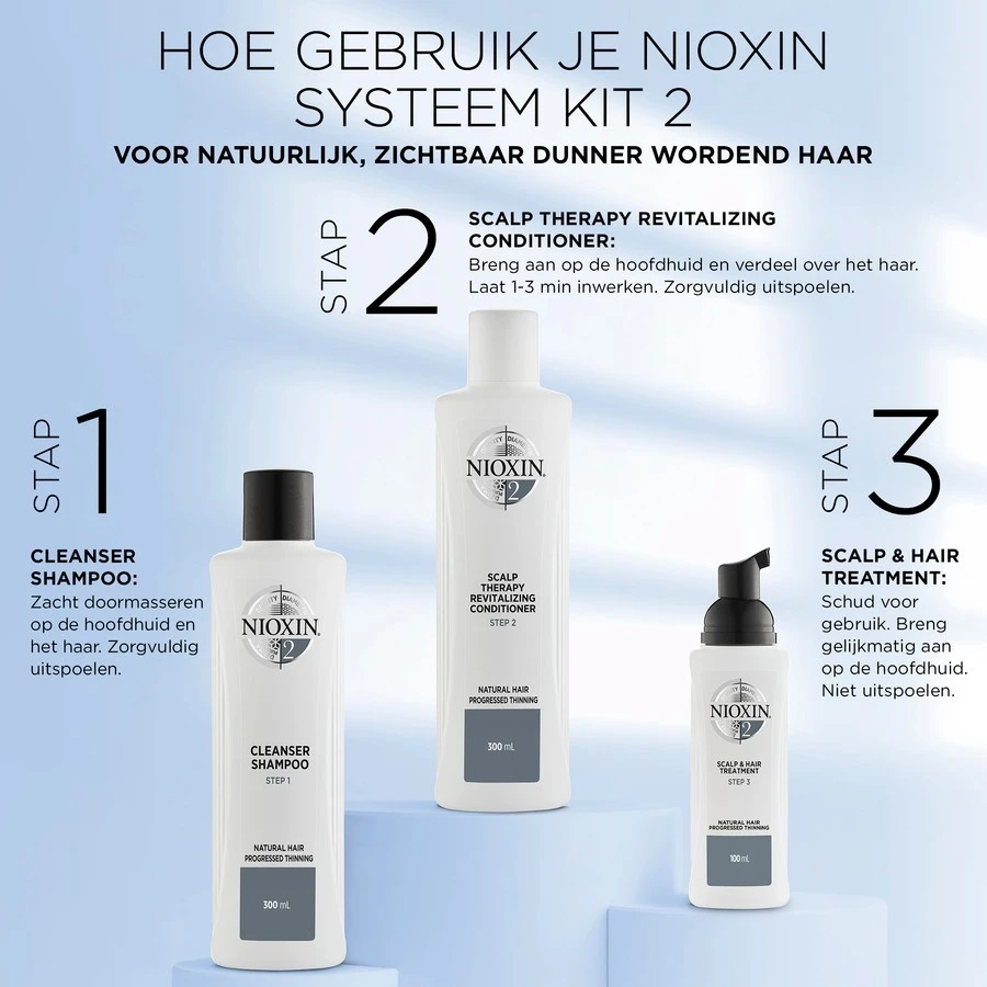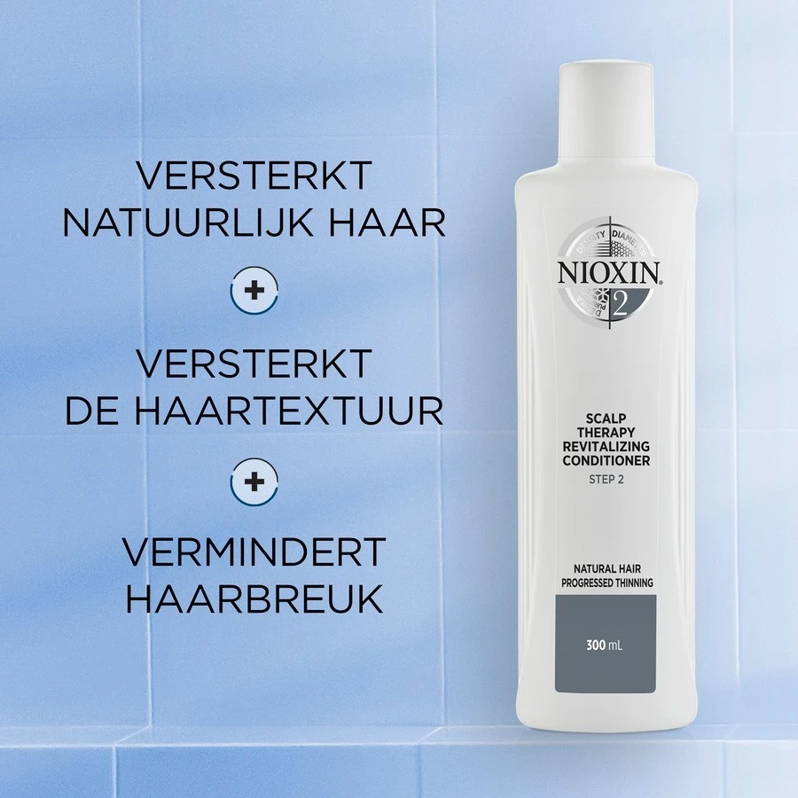 Zelfs natuurlijk en onbehandeld haar kan na verloop van tijd zichtbaar dunner worden. Om dit proces tegen te gaan, gebruikt u de Scalp Therapy Revitalising Conditioner van het Nioxin System 2 samen met de andere geschikte verzorgingscomponenten van Wella. Deze zorgen voor een gezonde glans van uw haar en maken dat het er ook voller en sterker uitziet. Tegelijkertijd wordt de haarstructuur versterkt en haarbreuk wordt aanzienlijk verminderd.