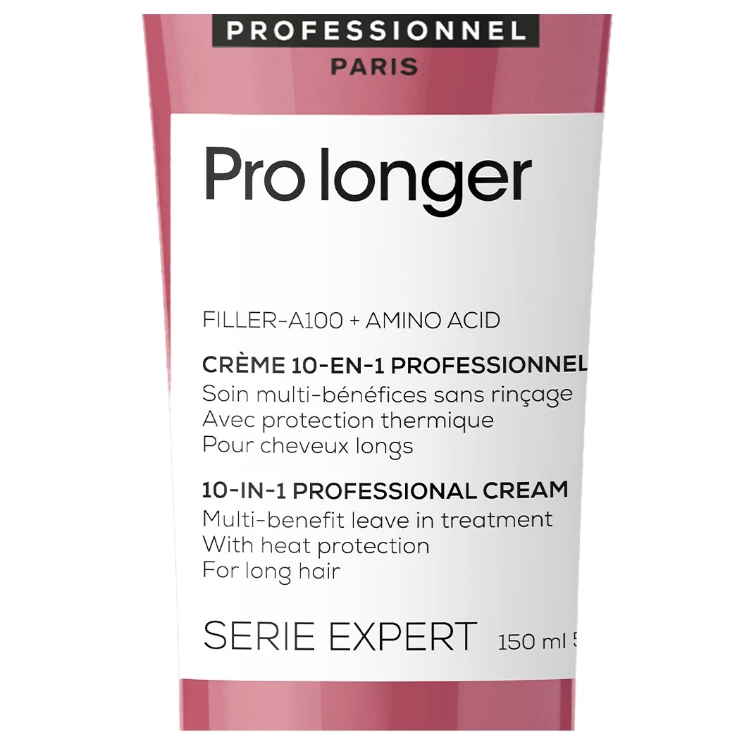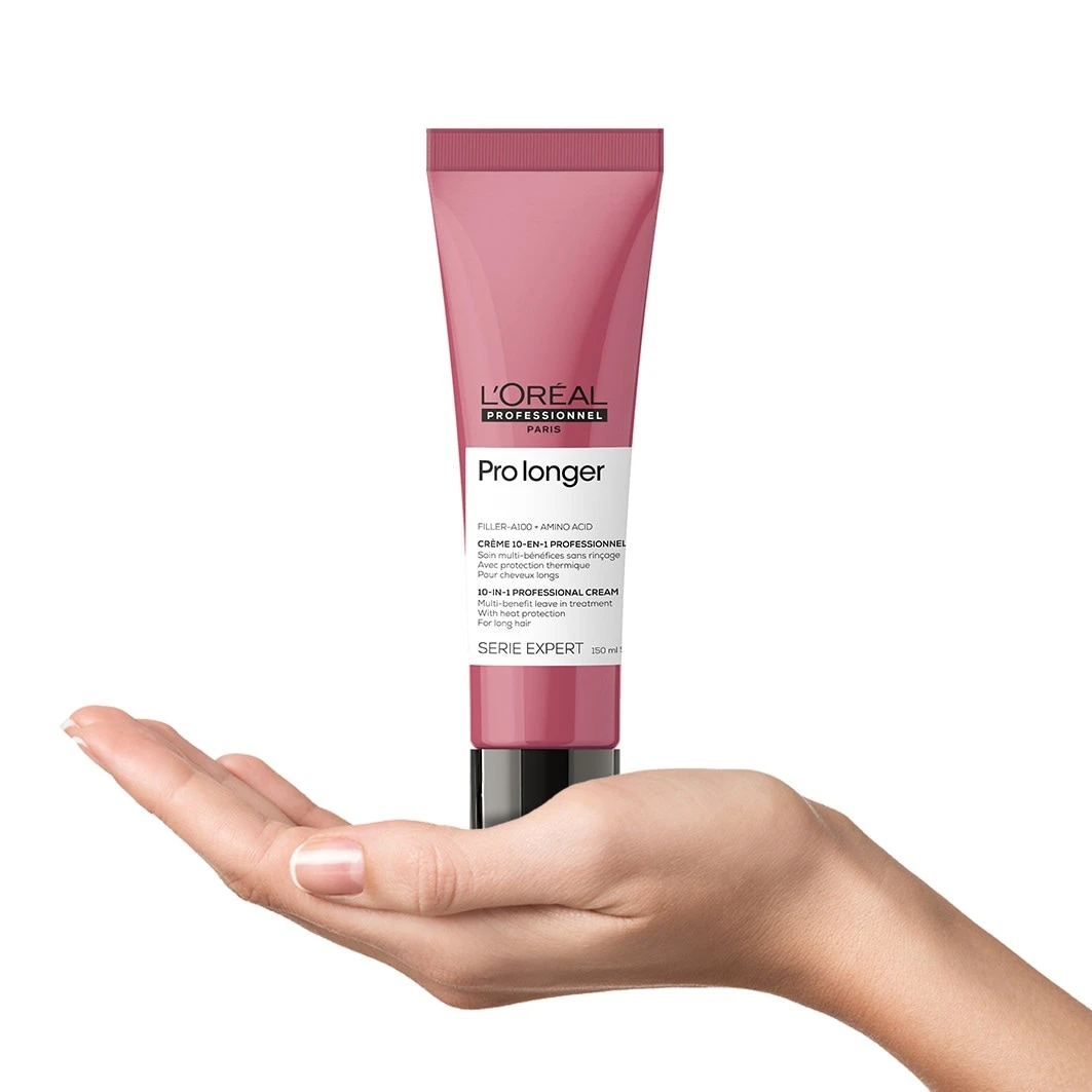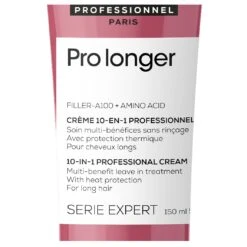 L’Oréal Professionnel Serie Expert Pro Longer Leave-In is een versterkende en verdikkende leave-in-crème voor lang haar met dunne punten. De crème richt zich speciaal op de lengtes en dunne uiteinden die een dosis kracht, body en glans kunnen gebruiken. Het innovatieve, gepatenteerde aminozuur Filler A-100 zorgt ervoor dat de haarvezel van binnenuit wordt gevuld, waardoor het haar zichtbaar versterkt en voller wordt. Doordat deze crème niet hoeft te worden uitgespoeld, is het effect onmiddellijk merkbaar.