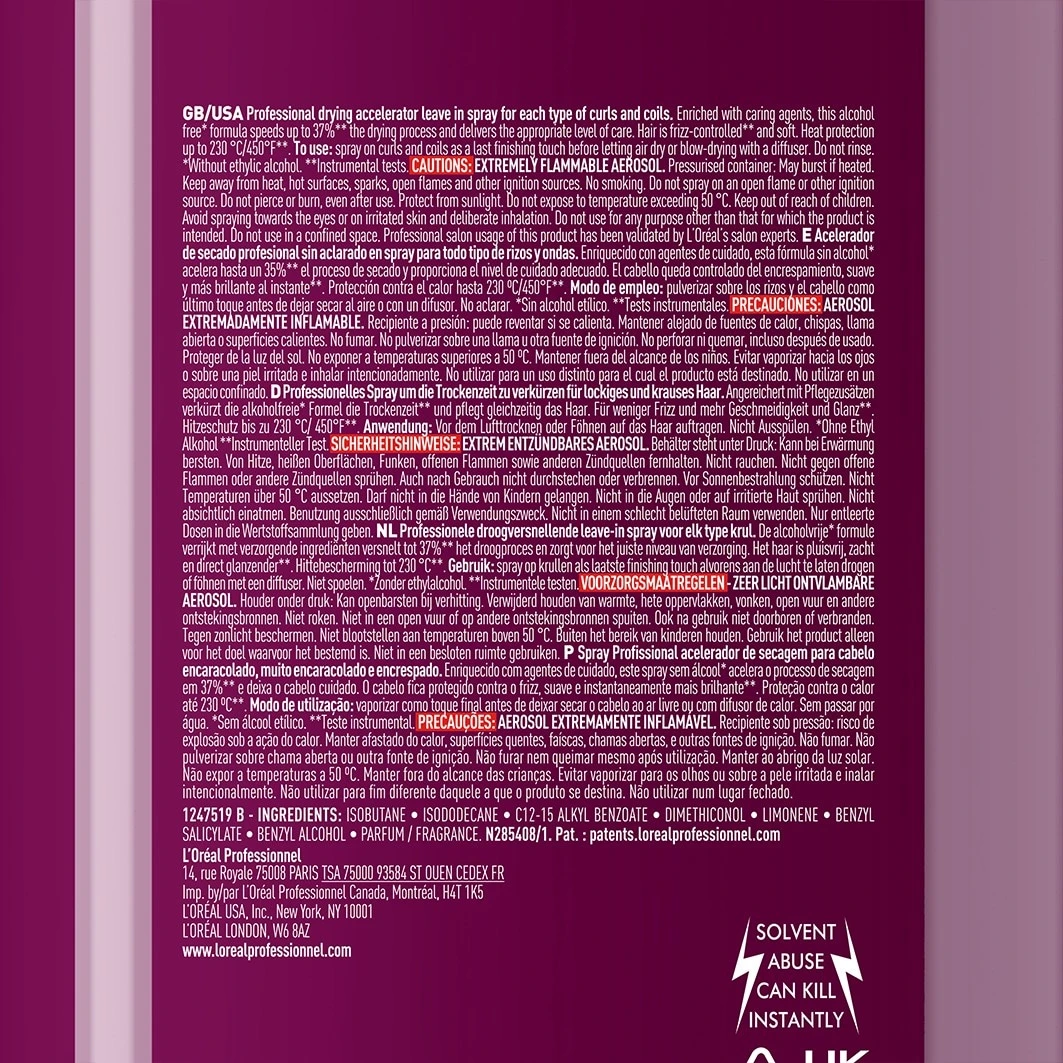 L’Oréal Professionnel Paris Curl Expression Drying Accelerator Leave-In is speciaal ontwikkeld voor krullend, golvend en kroeshaar. Verrijkt met voedende ingrediënten, de alcoholvrije* formule verkort de droogtijd** en hydrateert het haar. Voor minder kroezen, meer gladheid en glans**. Hittebescherming tot 230°C**. *zonder ethylalcohol **Instrumentele test.