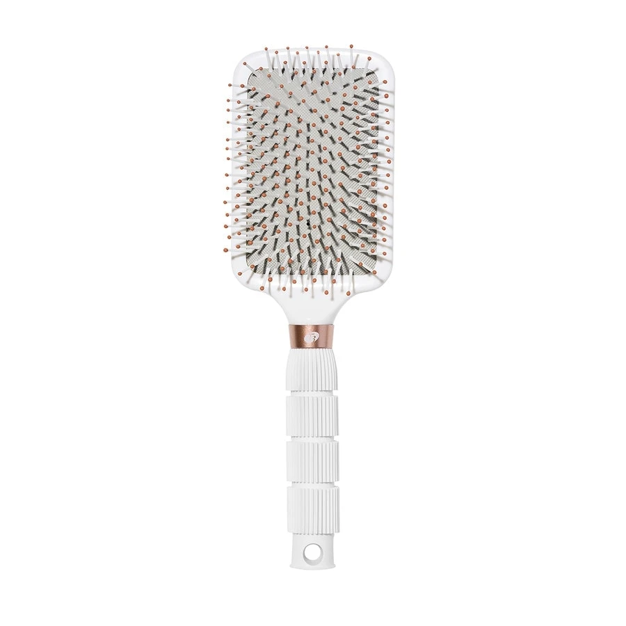 Met naadloze hitteresistente nylon borstelharen, een bekleed ontwerp en een brede platte basis, is de professionele T3 Smooth Paddle borstel ideaal om het haar sluik en glad te drogen. De naadloze hitteresistente nylon borstelharen ontwarren het haar en maken het voorzichtig glad, terwijl het zachte, slipvrije handvat zorgt voor een betere controle en moeiteloze styling.
