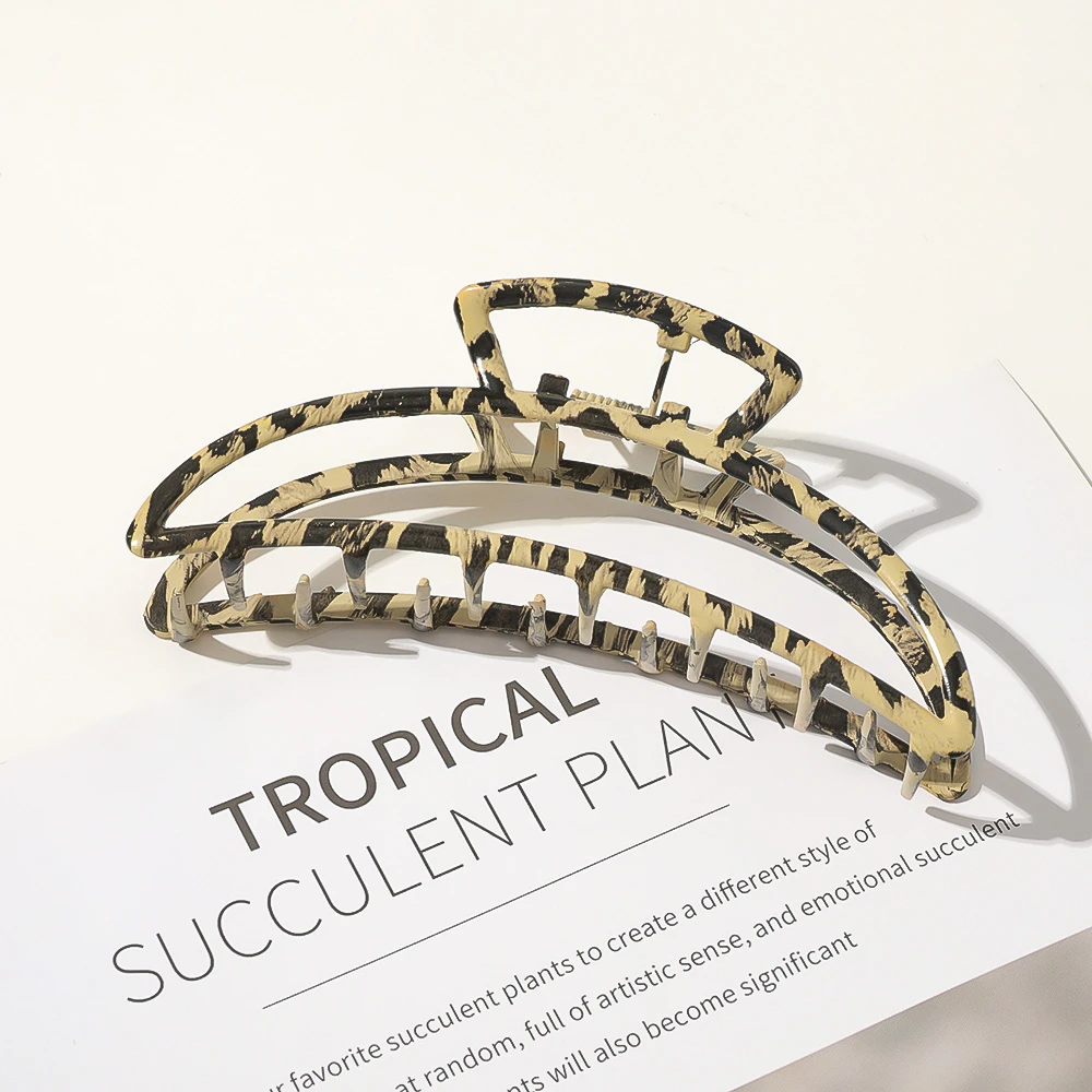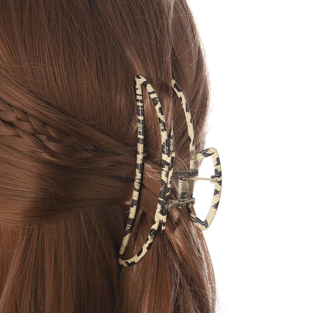 Metalen haarclip met luipaardpatroon. Perfect voor alle haarlengtes en structuren – dik, dun, krullend of glad haar – deze metalen clips grijpen uw haar gemakkelijk zonder te beschadigen en te beschadigen. Een geweldige manier om een āārommelige knol of bovenste knol te beveiligen en je kapsel een beetje glans te geven!
