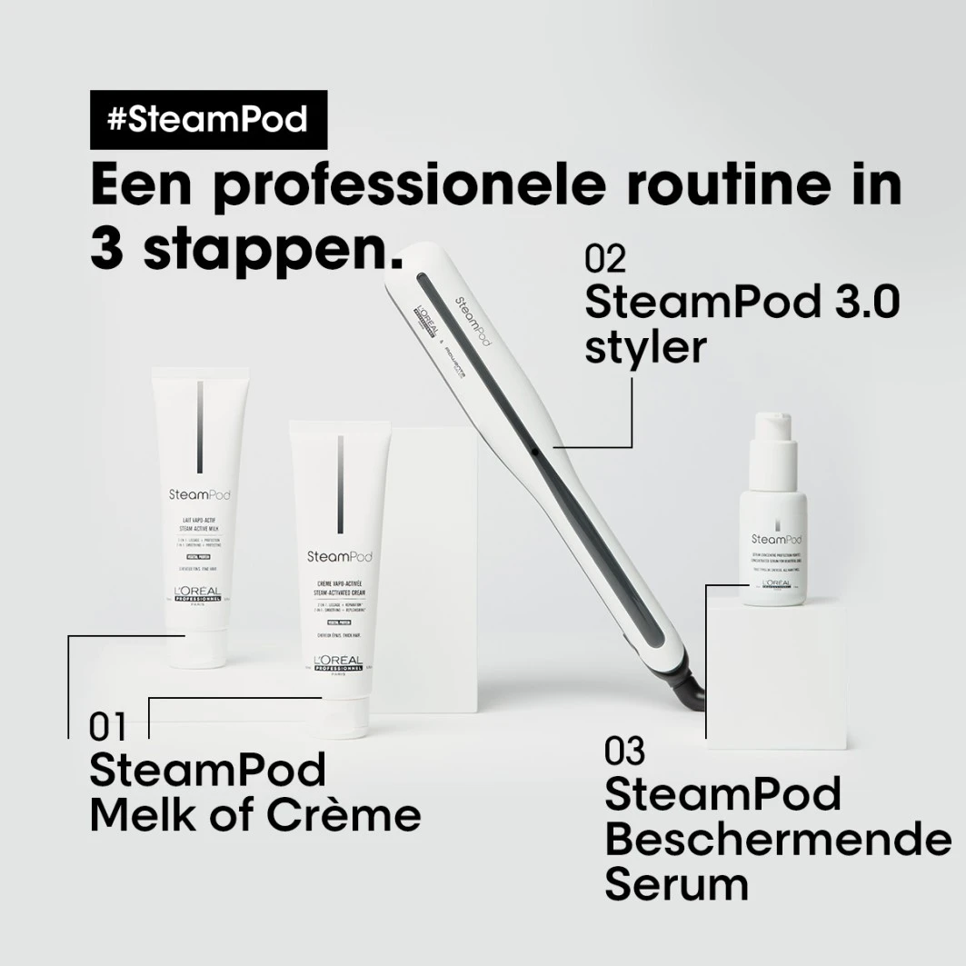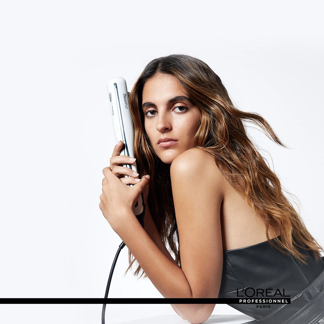 Transformeer je haar met de gepatenteerde stoomtechnologie van L’Oréal Professionnel en de revolutionaire Steampod 3.0: de unieke tool stylet het haar niet alleen bijzonder zacht door het te beschermen tegen schade door hitte, maar ook supersnel. Dankzij de continue stoomafgifte levert de Steampod 3.0 extreem gladde resultaten, zelfs op kroeshaar en zwaar krullend haar – hij creëert ook moeiteloos golven en krullen op steil haar. Het ergonomische ontwerp zorgt voor eenvoudig gebruik, de geïntegreerde kam, die ook kan worden verwijderd, zorgt voor een gelijkmatige verdeling van het haar op de keramische platen. Met deze stylingtool kun je gemakkelijk een gladde, zijdeachtige, glanzende afwerking krijgen zoals van een professional – en het resultaat is tot twee keer gladder en sneller1: in een instrumentele test leverde de Steampod twee keer sneller en creëerde twee keer zoveel gladde resultaten als de steampod zonder waterdamp en kam. Bovendien vond een instrumentele test tot 91 procent minder schade2 na 15 keer gebruiken in vergelijking met het gebruik van de Steampod zonder stoom en een kam.