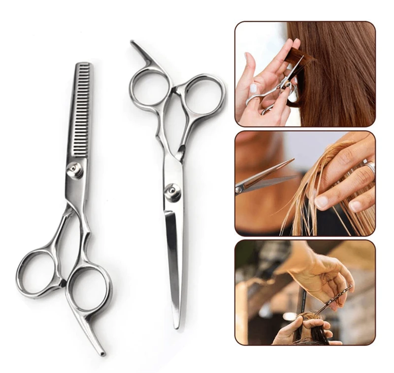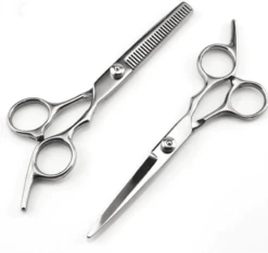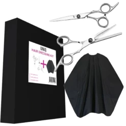 Kapper ingesteld met twee schaar en een kapper. De set bevat een schaar voor het knippen van haar en schaar om het haar uit te dunnen. Deze set is ideaal als je je haar thuis moet knippen.